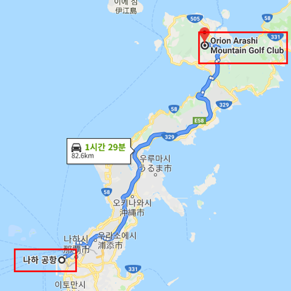 공항 기준나하 공항에서 차로 약 1시간 30분 소요 |