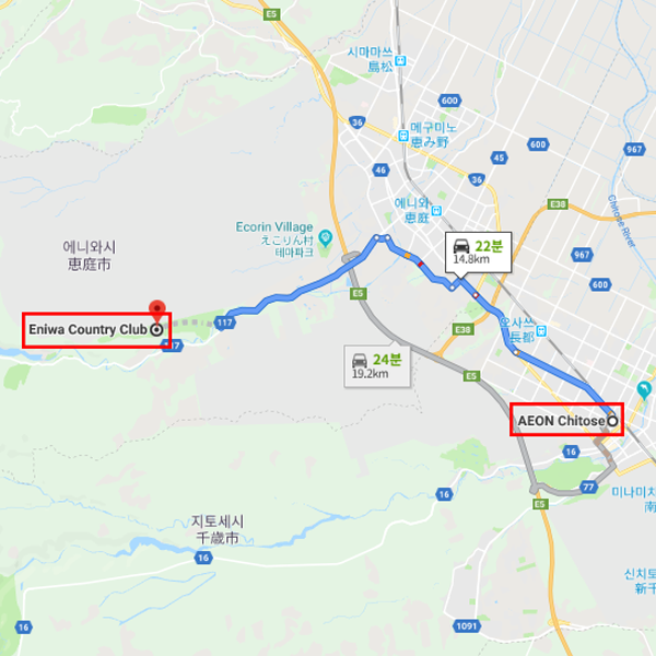 에니와 컨트리클럽 신치토세 공항에서 차로 약 23분 소요 에니와 컨트리클럽 수퍼마켓 이온 치토세점까지 차로 약 22분 소요