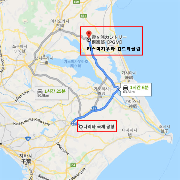 공항 기준나리타 공항에서 차로 약 1시간 6분 소요 |