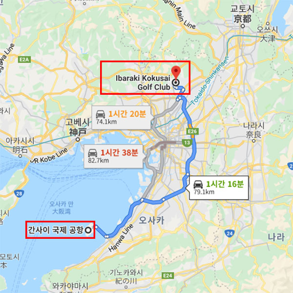 간사이 국제공항에서 차로 약 1시간 16분 소요