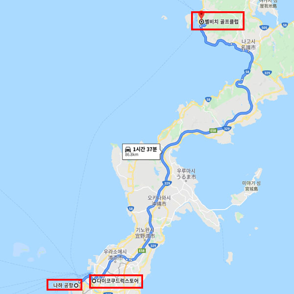 엑세스 공항 기준 : 나하공항에서 차로 약 1시간 29분