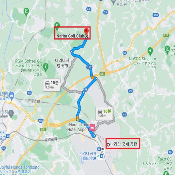 [아코디아] 나리타골프클럽 나리타 국제공항에서 차로 약 15분 소요 [아코디아] 나리타골프클럽 신주쿠 역에서 차로 약 1시간 20분 소요
