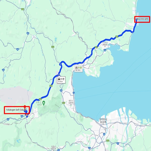 유후코겐 골프클럽(현지지불만가능) 후쿠오카 공항에서 차로 약 1시간 35분 소요 유후코겐 골프클럽(현지지불만가능) 오이타 공항에서 차로 약 50분(유후인역에서 차로 약 10분)