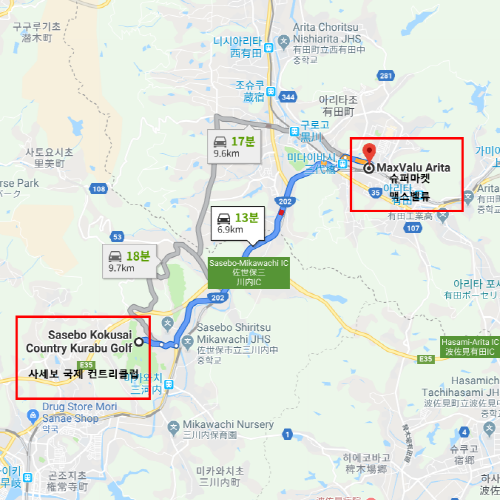수퍼마켓 맥스벨류 아리타점까지 차로 15분 소요